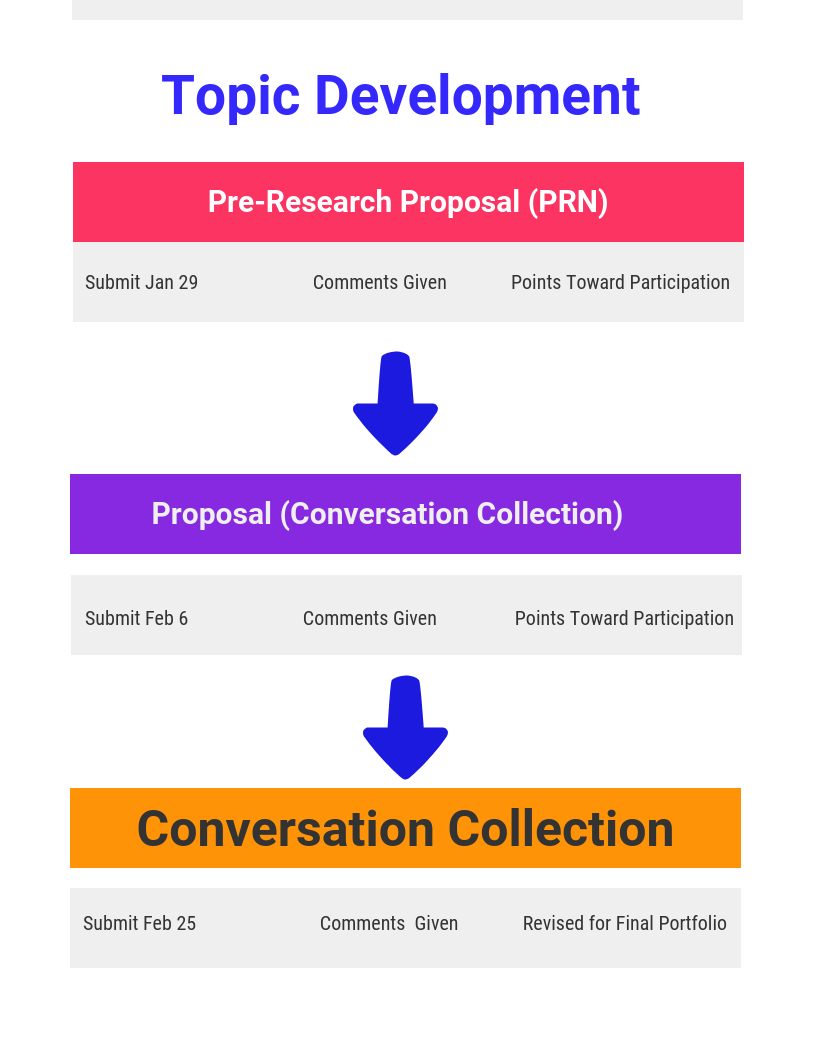 You might look at the class in three ways, as a set of documents submitted in a final portfolio, as the outcome of a process of inquiry, or as a series of steps in a process of research and writing.