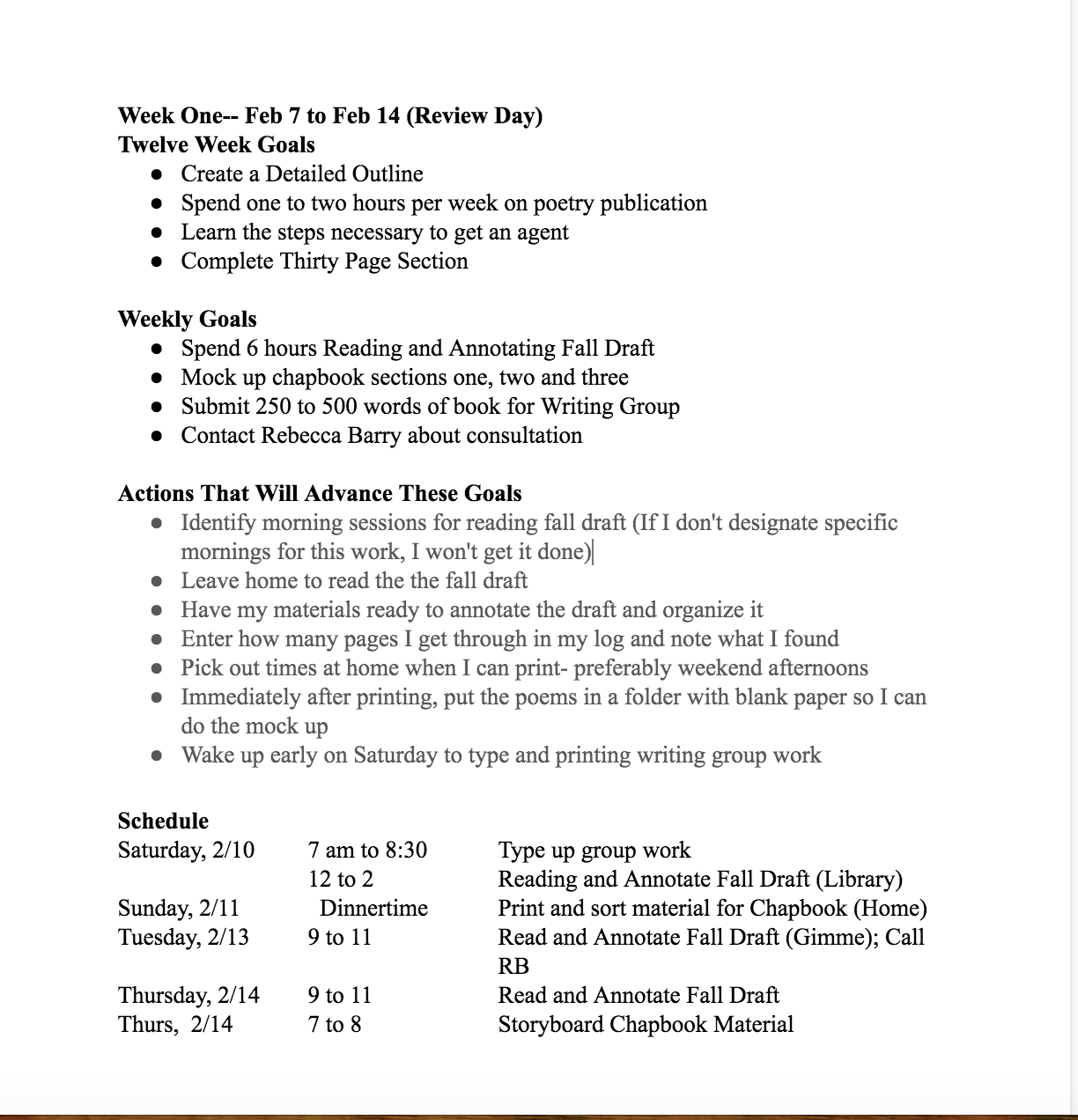 By the end of twelve weeks, I want to be able to see the results I’ve described above. Notice that two of my goals are written products (an outline and a draft), but one will provide me with information I need to publish the completed work, and one concerns doing what’s necessary to publish already completed work.